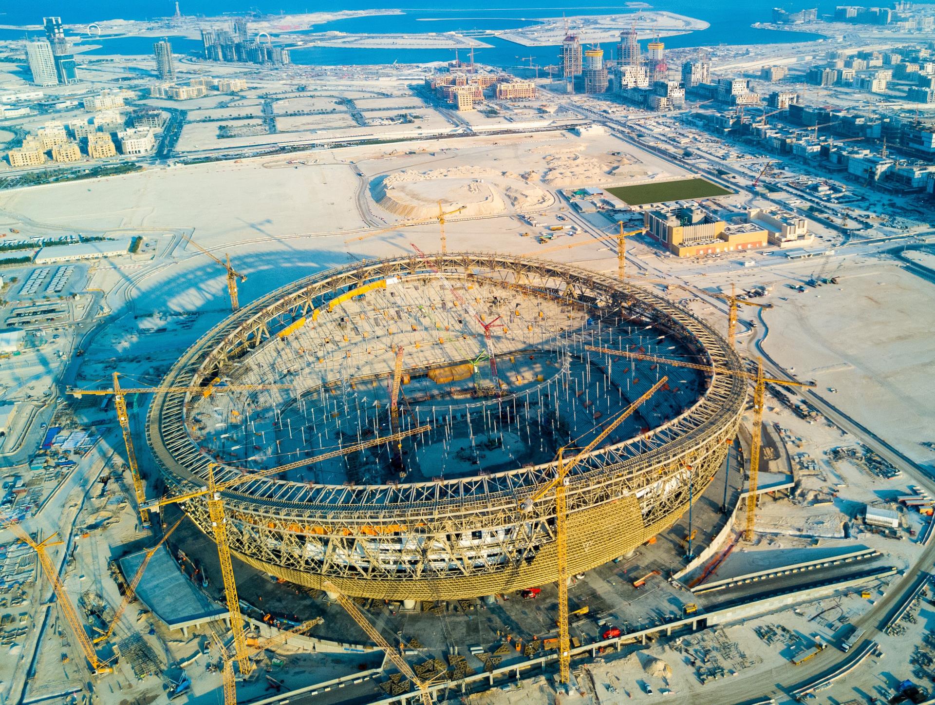 △中聯(lián)重科塔機(jī)助建盧賽爾體育場(chǎng)(圖片來(lái)源:鐵建國(guó)際)