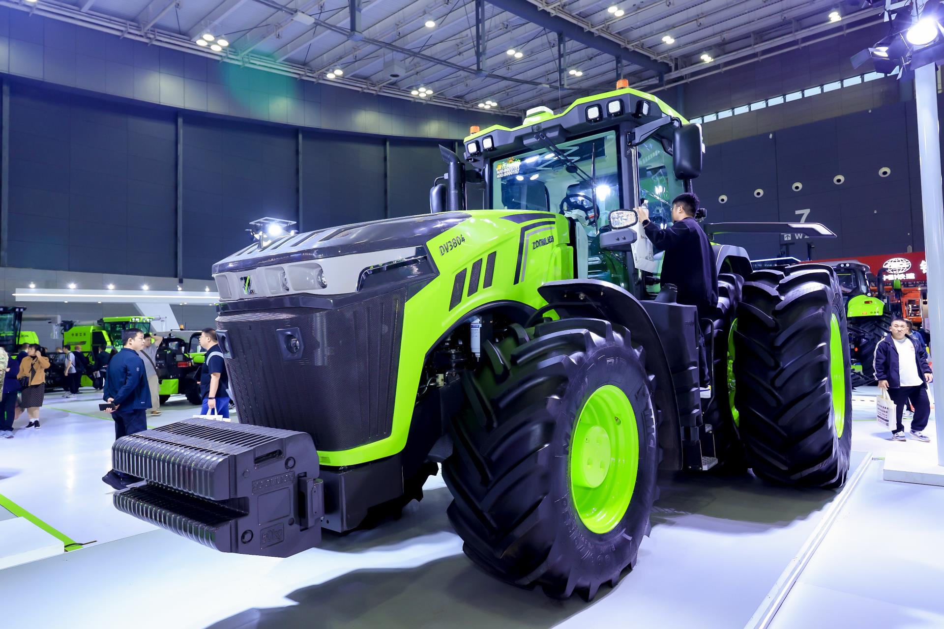 中聯(lián)重科自主研發(fā)的首款380馬力DV3804混合動力拖拉機,則具有綠色智能、高效精準的亮點。它采用柴電混動系統(tǒng),可應對多種作業(yè)工況,為用戶帶來非凡的收益;配備0~40km/h區(qū)間無極變速箱,作業(yè)效率更高,變速體驗更平順;行走采用電機直驅技術,起步更平順,無動力跳躍。整機采用國際化設計理念,讓駕駛更舒適、操作更便捷安全,并標配了導航及輔助駕駛功能,助力實施精準農業(yè)。