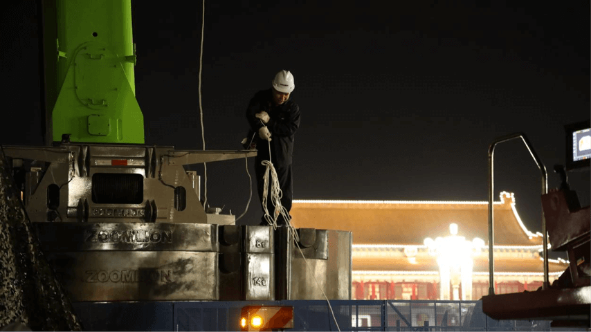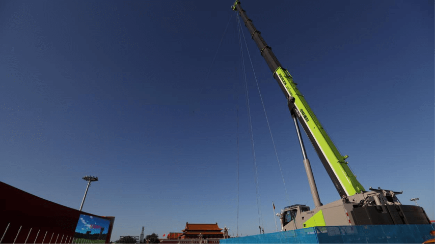 ▲中聯(lián)重科汽車起重機聳立在天安門廣場架設(shè)天鷹座拍攝系統(tǒng)助力大慶直播
