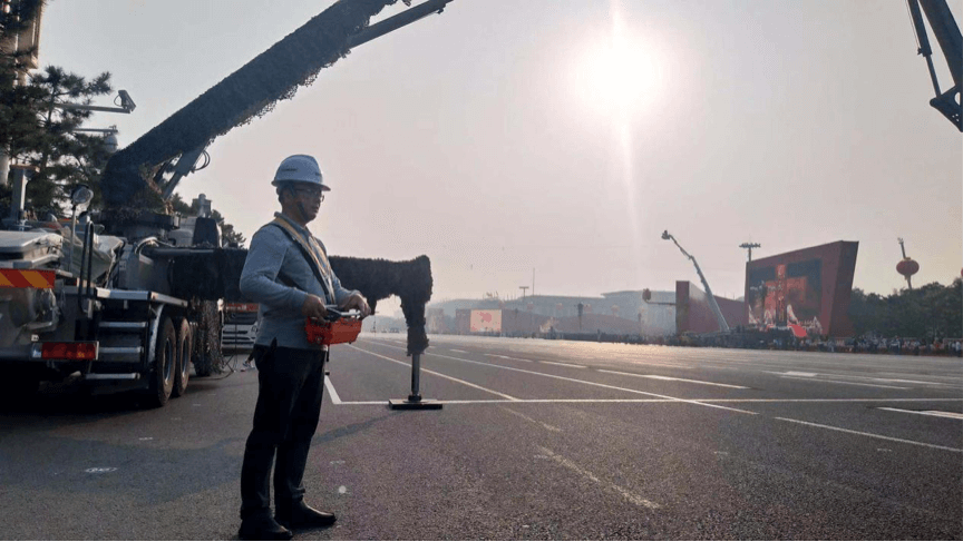 此外,為呈現(xiàn)慶典活動隊伍整裝待發(fā)、行進的全過程,央視拍攝團隊還精選了中聯(lián)重科40米泵車和53米云梯消防車作為長安街沿線的高機位支撐。其中,40米泵車被改裝為“大搖臂攝像機”,這個機位通過空間的壓縮可以將所有閱兵隊伍在一個鏡頭畫面中呈現(xiàn)。拍攝過程中,需在90秒內(nèi)調(diào)整至多種姿態(tài)和高度進行拍攝,中聯(lián)重科泵車嚴絲合縫精準操作,以極致的響應速度和穩(wěn)定性滿足了臂端攝像機的拍攝需求,為觀眾清晰地呈現(xiàn)了精彩、壯觀的畫面。