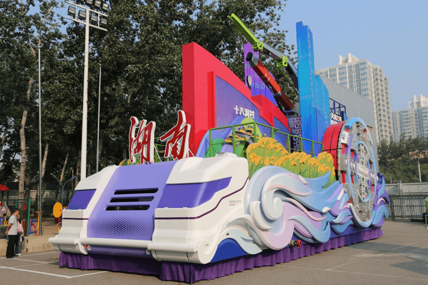 在群眾游行活動中,各式各樣、各具特色的彩車精彩紛呈,受到了廣大觀眾的喜愛,熱鬧歡騰的隊伍更添喜慶氛圍。湖南彩車——“瀟湘今朝”,將工程機械湘軍的獨特元素和湖南制造的強大實力凝聚在彩車上,打造了唯一采用工程機械底盤改裝的彩車。