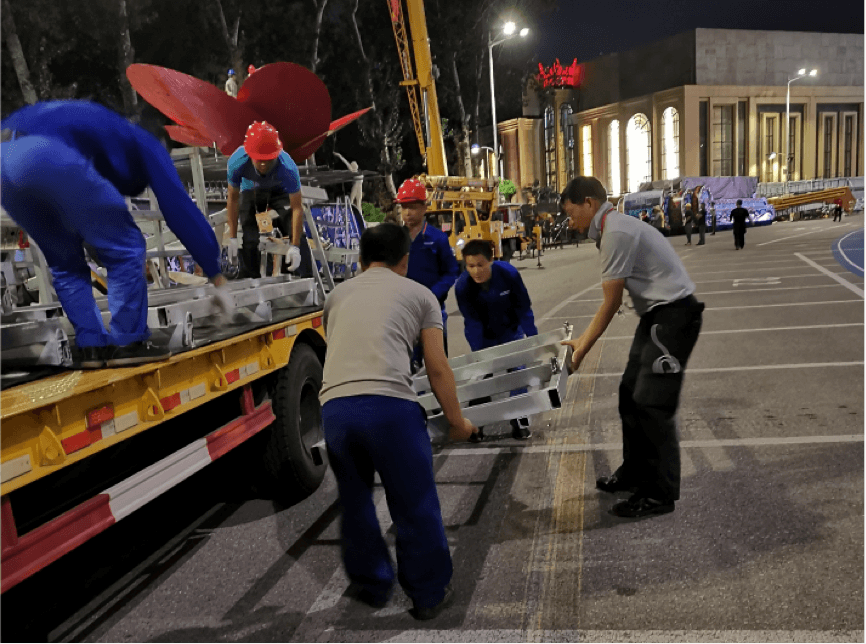 ▲湖南彩車制作小組副組長王旭虹與組員一起搬運物料