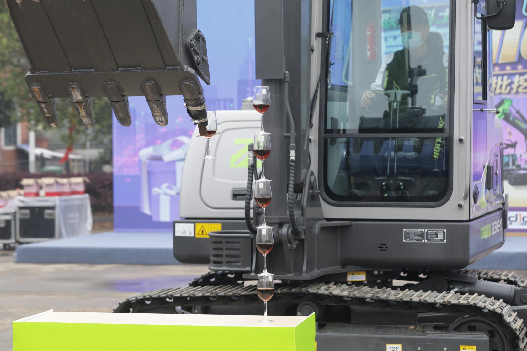 直播現(xiàn)場,中聯(lián)重科ZE60E-10挖掘機表演了連人手都很難操作的“疊酒杯”高難度動作。只見機手輕松用鏟斗斗齒將裝滿紅酒的酒杯成功疊加在一起,里面的紅酒沒有一點傾灑,完美的“人機合一”讓人驚嘆。