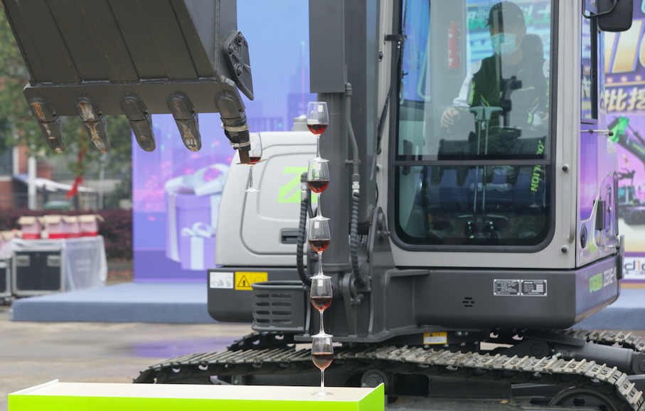 △中聯(lián)重科產(chǎn)品經(jīng)理結合ZE60E-10挖掘機疊高腳杯表演講解產(chǎn)品性能