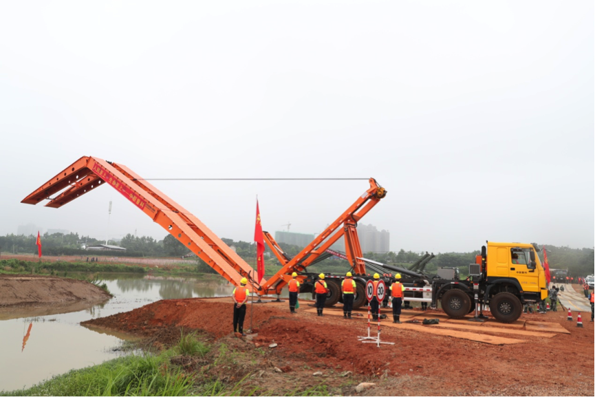 ? ?在“搭建臨時(shí)道路、橋梁”演練科目中,模擬了雨情、水情快速發(fā)展導(dǎo)致長沙市望城某區(qū)域洪水沖毀了道路、橋梁,搶險(xiǎn)救援物資無法運(yùn)抵現(xiàn)場的緊迫場景。危難之時(shí),中聯(lián)重科重型工程機(jī)械應(yīng)急救援隊(duì)和駐湘武警某部交通**一支隊(duì)緊急出動(dòng)應(yīng)急架橋車和鋪路車進(jìn)行搶險(xiǎn)。演練中,中聯(lián)重科應(yīng)急架橋車停在損毀的橋梁邊,指揮員、安全員、操作手,迅速到位。應(yīng)急架橋車底盤穩(wěn)健展平,操作機(jī)手手持遙控器,沉穩(wěn)架設(shè),短短14分鐘,一座長25米、寬3.2米的臨時(shí)橋梁就已搭建完畢,迅速恢復(fù)了通行。該臨時(shí)橋梁可承載30噸,**大限度保障人員、設(shè)備、物資安全通過。