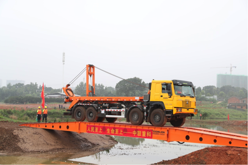 △中聯(lián)重科應(yīng)急架橋車正在搭建臨時(shí)橋梁