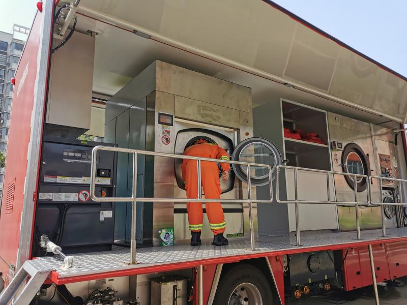 據(jù)介紹,中聯(lián)重科大型被服洗滌車結合洗滌設備特點和應急救援實戰(zhàn)中衣物洗滌需求創(chuàng)新設計而成。被服洗滌車工作能力強大,單次工作(約一小時)**大可洗脫、烘干100kg衣物,能將臟衣物快速處理成潔凈、干爽的衣物。同時,車輛采取獨有專利技術,全程一鍵控制,自動選擇洗滌參數(shù),滿足多種消防衣物洗烘需求,快捷高效。此外,車輛還擁有舒適的工作環(huán)境,裝備了超靜音發(fā)電機和靜音水泵,有效降低工作噪聲。作業(yè)空間大,超大儲物容積可滿足多種儲存需求。