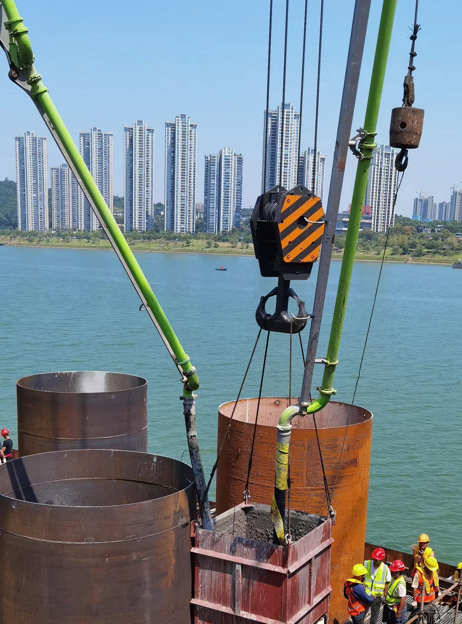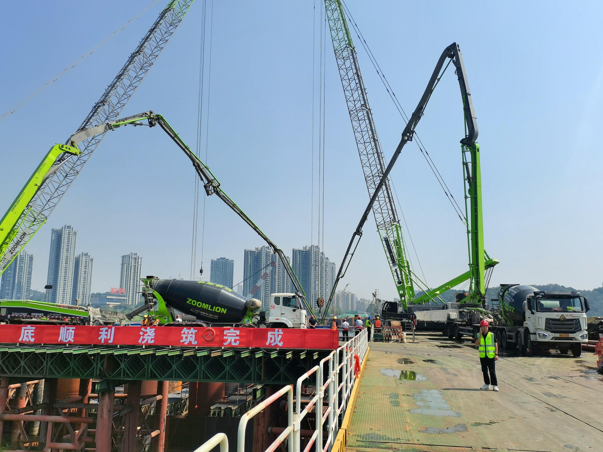 其主墩承臺(tái)設(shè)計(jì)為深埋式“啞鈴型”,鋼圍堰封底工作是**關(guān)鍵、也是連續(xù)作業(yè)時(shí)間**長的工序。為確保澆筑品質(zhì)和效率,施工方經(jīng)多方對比,**終選擇了中聯(lián)重科“凌云”系列泵車來完成任務(wù)。操作機(jī)手也對中聯(lián)重科的泵車情有獨(dú)鐘:“中聯(lián)的泵車臂架一直都很穩(wěn),打料快、油耗也低!”