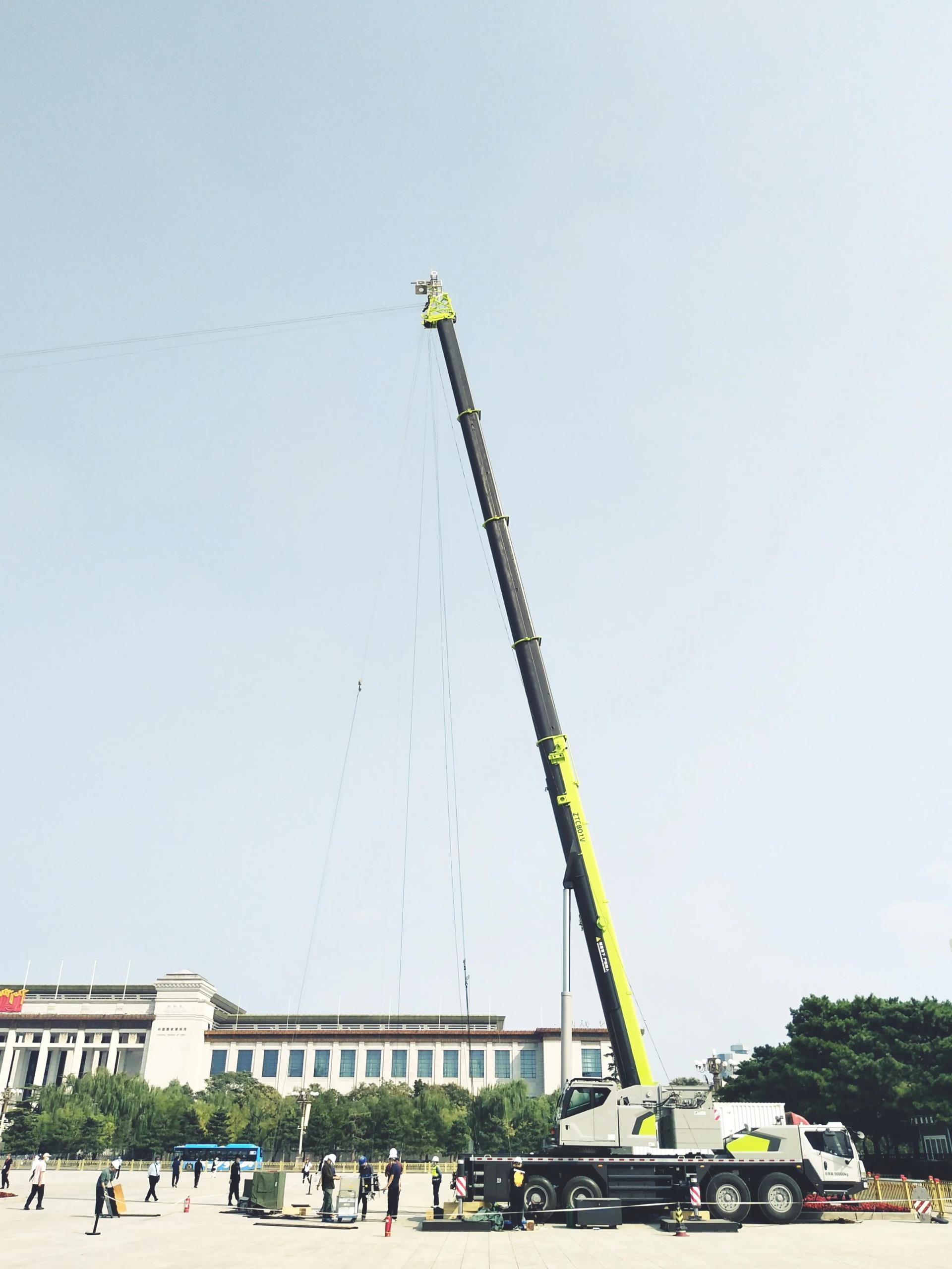 在儀式現場,天安門廣場南北兩側位置,兩臺“極光綠”汽車起重機以卓越品質和穩(wěn)定性能支撐搭建起一條高40米、長300米的空中索道,其搭載的“天鷹座索道攝像系統”從高空完美呈現了整場活動的全景視角,讓廣大觀眾更真切地感受儀式的現場氛圍。
