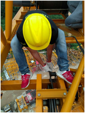 ▲小分隊成員與塔機師傅交談,仔細(xì)檢查設(shè)備的每個環(huán)節(jié)?