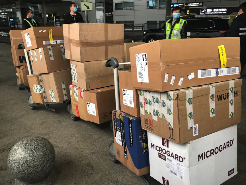 △中聯(lián)重科海外員工在法蘭克福機場準(zhǔn)備發(fā)送防護(hù)物資