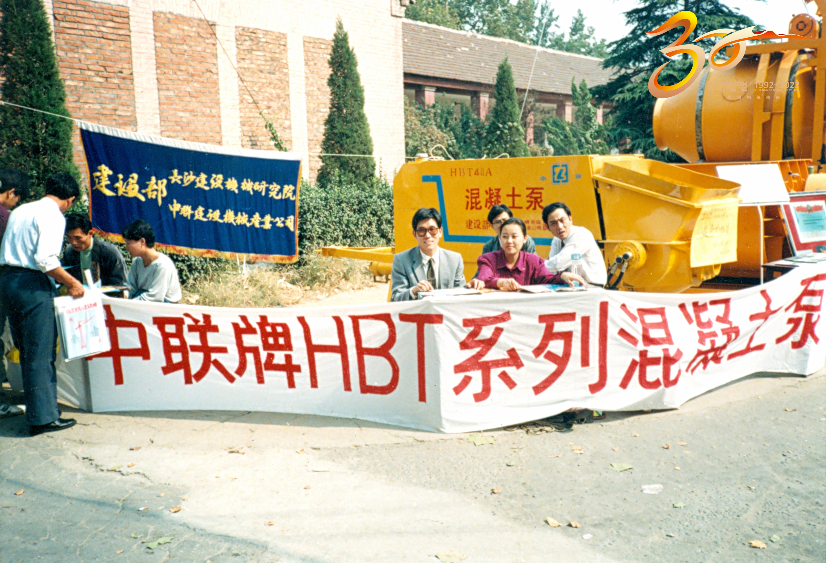 據(jù)親歷者回憶,他們打出了兩條橫幅。上面寫(xiě)著“建設(shè)部、長(zhǎng)沙建設(shè)機(jī)械研究院中聯(lián)建設(shè)機(jī)械產(chǎn)業(yè)公司”。當(dāng)時(shí),剛成立不久的中聯(lián)重科在業(yè)內(nèi)知名度不高,于是他們充分利用建設(shè)部、長(zhǎng)沙建設(shè)機(jī)械研究院的權(quán)威性和知名度,打出這條橫幅來(lái)吸引客戶(hù)。此外,桌前的這條“中聯(lián)牌HBT系列混凝土泵”橫幅還是手寫(xiě)上去的。