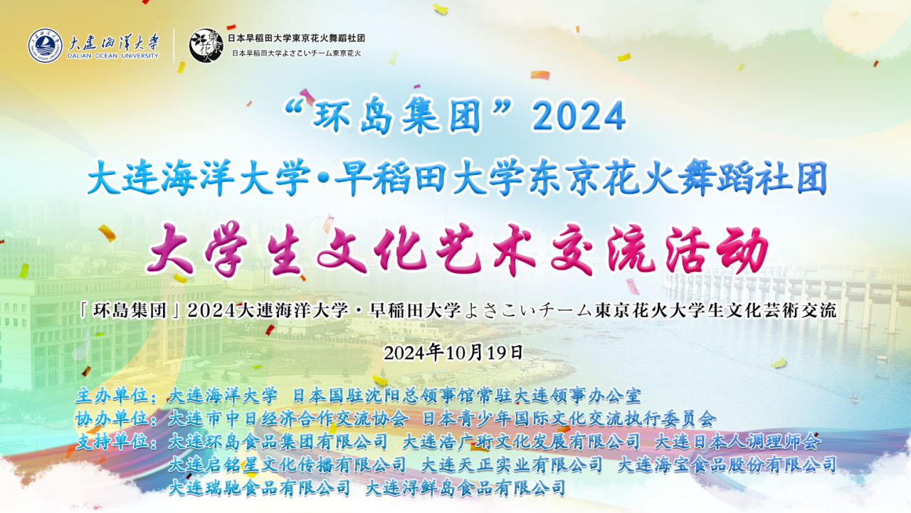 10月19日,由大連環(huán)島食品集團獨家贊助的 “2024大連海洋大學(xué)·早稻田大學(xué)東京花火舞蹈社團大學(xué)生文化交流活動”在大連海洋大學(xué)黑石礁校區(qū)舉行。中日大學(xué)生以舞為媒,共同打造了一場璀璨奪目、跨越國界的藝術(shù)盛宴。本次活動由大連海洋大學(xué)、日本國駐沈陽領(lǐng)事館常駐大連領(lǐng)事辦公室主辦;大連市中日經(jīng)濟合作交流協(xié)會、日本青少年國際文化交流執(zhí)行委員會協(xié)辦;大連環(huán)島食品集團有限公司獨家冠名贊助。大連海洋大學(xué)各級領(lǐng)導(dǎo),…